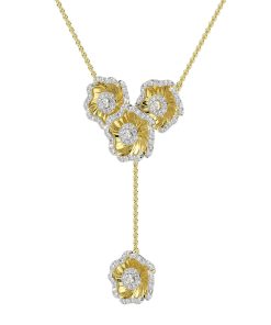 The Halo Flower Rose Gold Y Necklace is an 18 karat rose gold delicate chain with a trio of rose gold and natural diamond camellia-inspired flowers at its center. A fourth flower hangs by a rose gold chain.