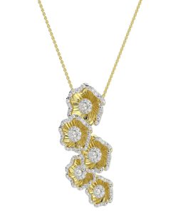The Halo Flower Yellow Gold Necklace is an 18 karat yellow gold delicate chain with a pendant composed of five staggered gold and natural diamond camellia-inspired flowers.