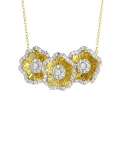 The Halo Flower Yellow Pendant Necklace is an 18 karat yellow gold delicate chain with a pendant composed of three yellow gold and natural diamond camellia-inspired flowers at its center.