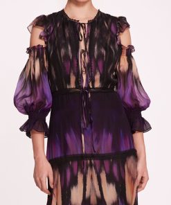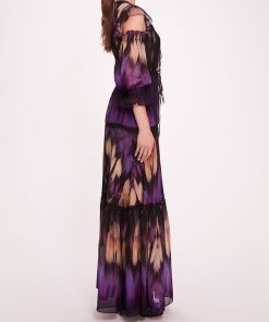 The Abstract Viscose Maxi Dress is a vision of modern sophistication, boasting an abstract print on silk viscose fabric. Its tied front details and ruffled cold shoulder add a contemporary flair, while the tiered body with hem ruffle creates a graceful silhouette. Delicate lace trims and smocked cuffs complete the look.