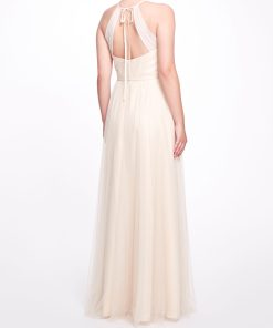 The Sicily gown in champagne is reminiscent of its namesake, a city in Italy. Featuring a halter neck, a-line silhouette, tulle panels, a sheer construction, a waist tie, a back tie fastening, and an open back, this dress is elegant and heavenly.