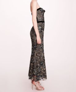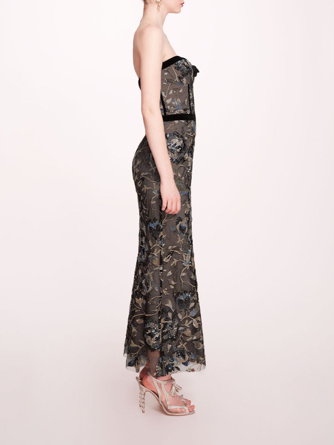 Make a stunning impression with the Climbing Vines Midi Dress, featuring a strapless design adorned with exquisite sequin floral embroidery on delicate tulle. The corset-style velvet detailing on the bodice accentuates your figure, offering a perfect blend of sophistication and allure.