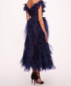 The Matte Organza Midi Dress features a v-neckline and a criss-cross ruffle detail that frames the neckline. The off-the-shoulder sleeves and raw-edge ruffled skirt adds texture and movement, creating a striking balance of sophistication and modern flair for your next cocktail event.