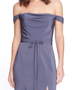 Modern romance becomes an effortless reality in the Rimini gown in steel blue. Featuring an amorous pleated bodice, a lush ribbon belt at the waist, and a soft sweetheart off the shoulder neckline.