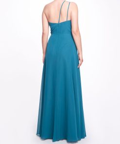 The Pescara gown in emerald is the epitome of glamour. Featuring a one-shoulder design, peekaboo detail, and a tie at the waist, the dress is subtly romantic.